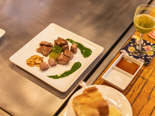 - Teppanyaki-grilled Shizuoka wagyu beef with seasonal vegetables and matcha sauce